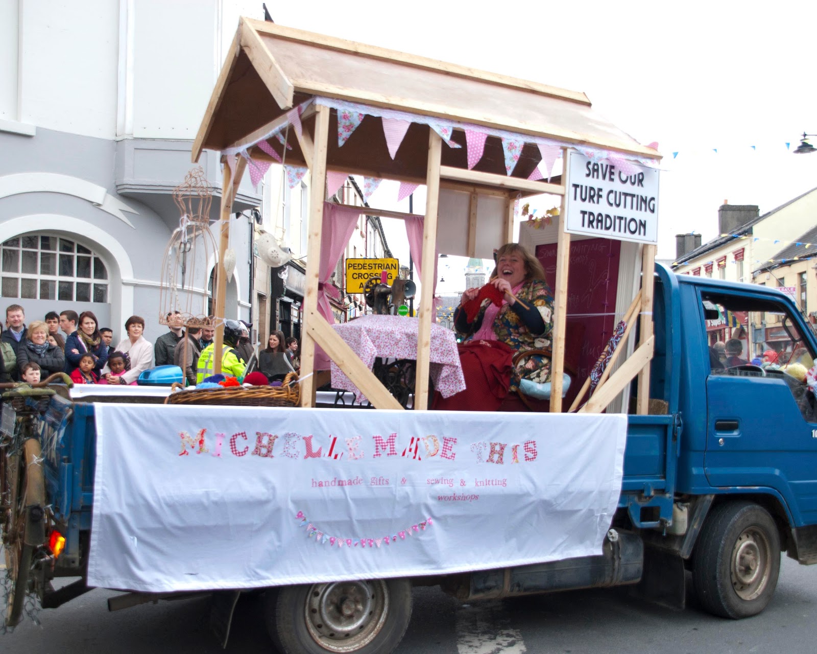 I was also busy getting ready for our local Easter Parade. This is a pic of me on the back of my Dad’s truck in what is supposed to be a representation of me running sewing and knitting workshops in my cottage. Unfortunately the ‘cottage’ was still being built the night before so I didn’t get to paint it but hopefully the gingham curtains and bunting made up for that.