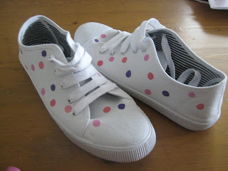 I saw these in Dunnes yesterday and thought they are just calling out for some polka dots so I handed over my 4 euro (yes, that’s all they cost) and after a little touch up with my new fabric pens that I got here … voila! My very own polka dot plimsoles.