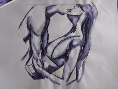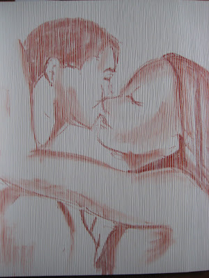 This is a combination of three sketches, the first was red oil pastel (1 minute) where the negative space was sketched, then the pink pastel (1 minute) was used to add shading and the black pastel (1 minute) to finish it. Not my fav actually as I think it looks a bit violent as opposed to a loving embrace. Funny how the drawing technique can change the look of a picture.
