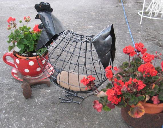 and my lovely fat hen that I got a few weeks ago in TK Maxx. So far the geraniums are still in flower but I’m sure that won’t be for long.